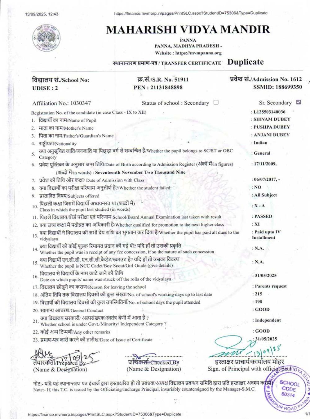 | 1 | 1612 | SHIVAM DUBEY | X | A | |