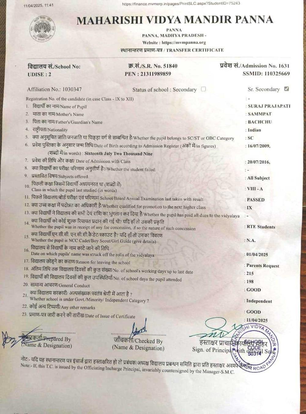 | 9 | 1631 | SURAJ PRAJAPATI | VIII | A | |