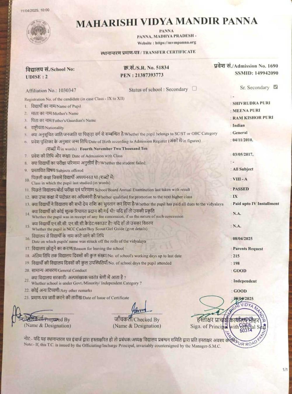 | 11 | 1690 | SHIVRUDRA PURI | VIII | A | |