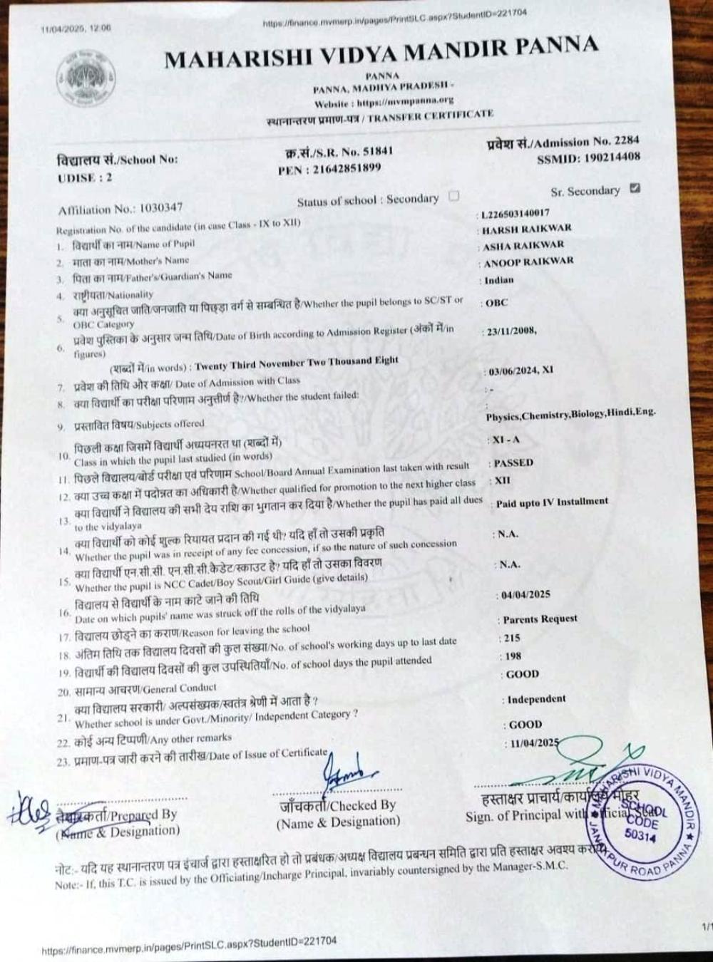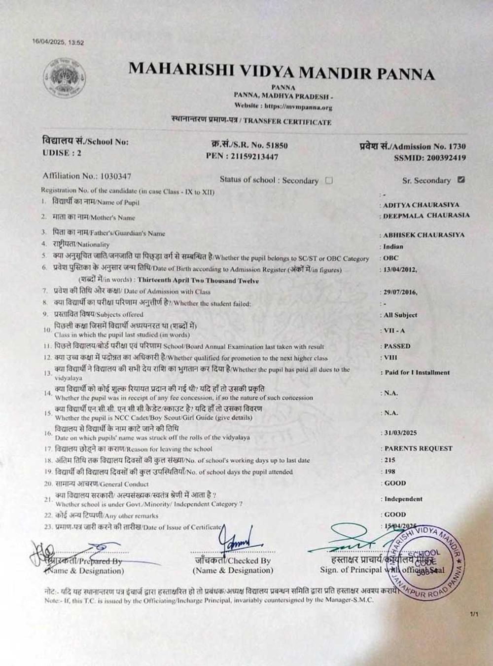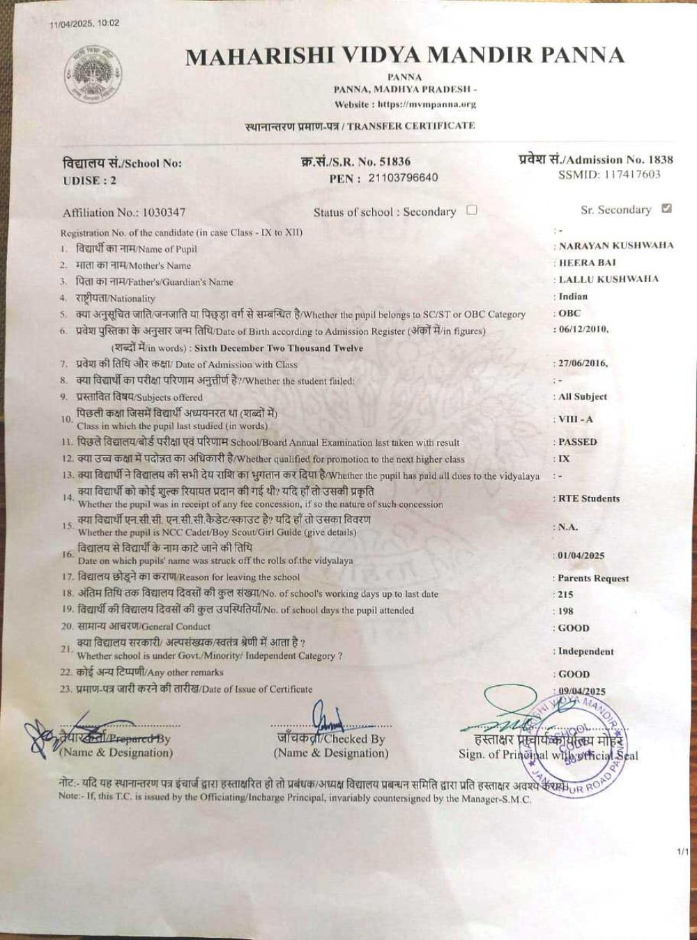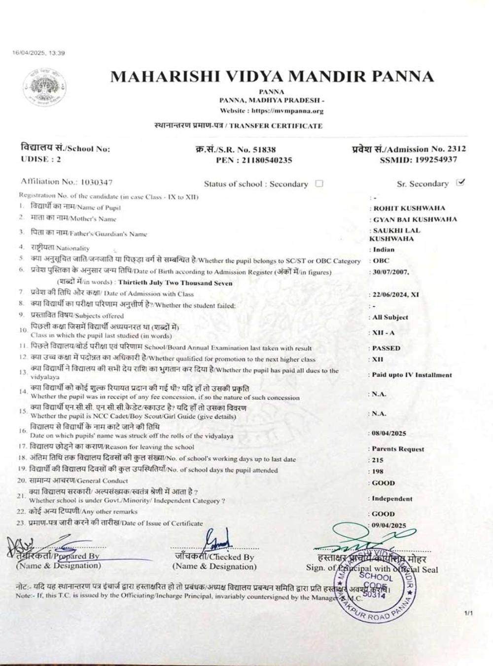| 16 | 1838 | NARAYAN KUSHWAHA | VIII | A | |