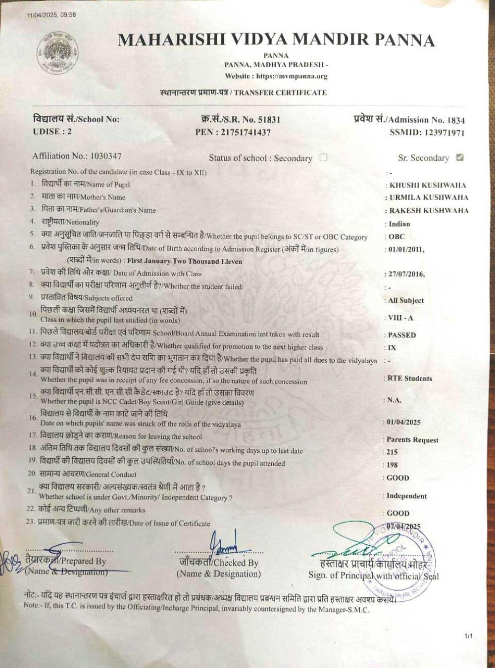 | 17 | 1834 | KHUSHI KUSHWAHA | VIII | A | |