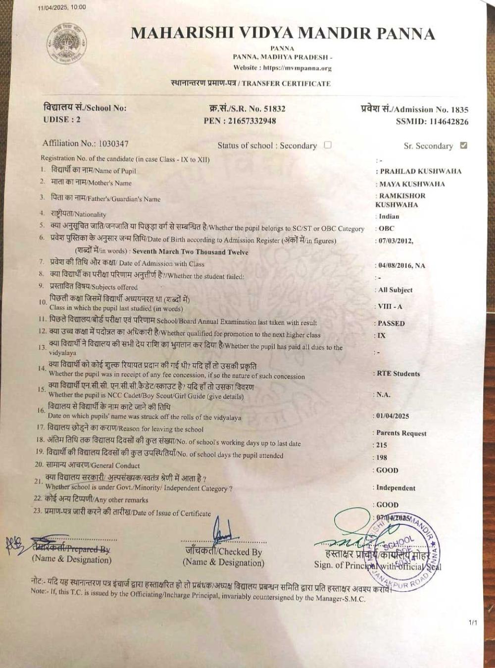 | 15 | 1835 | PRAHLAD KUSHWAHA | VIII | A | |