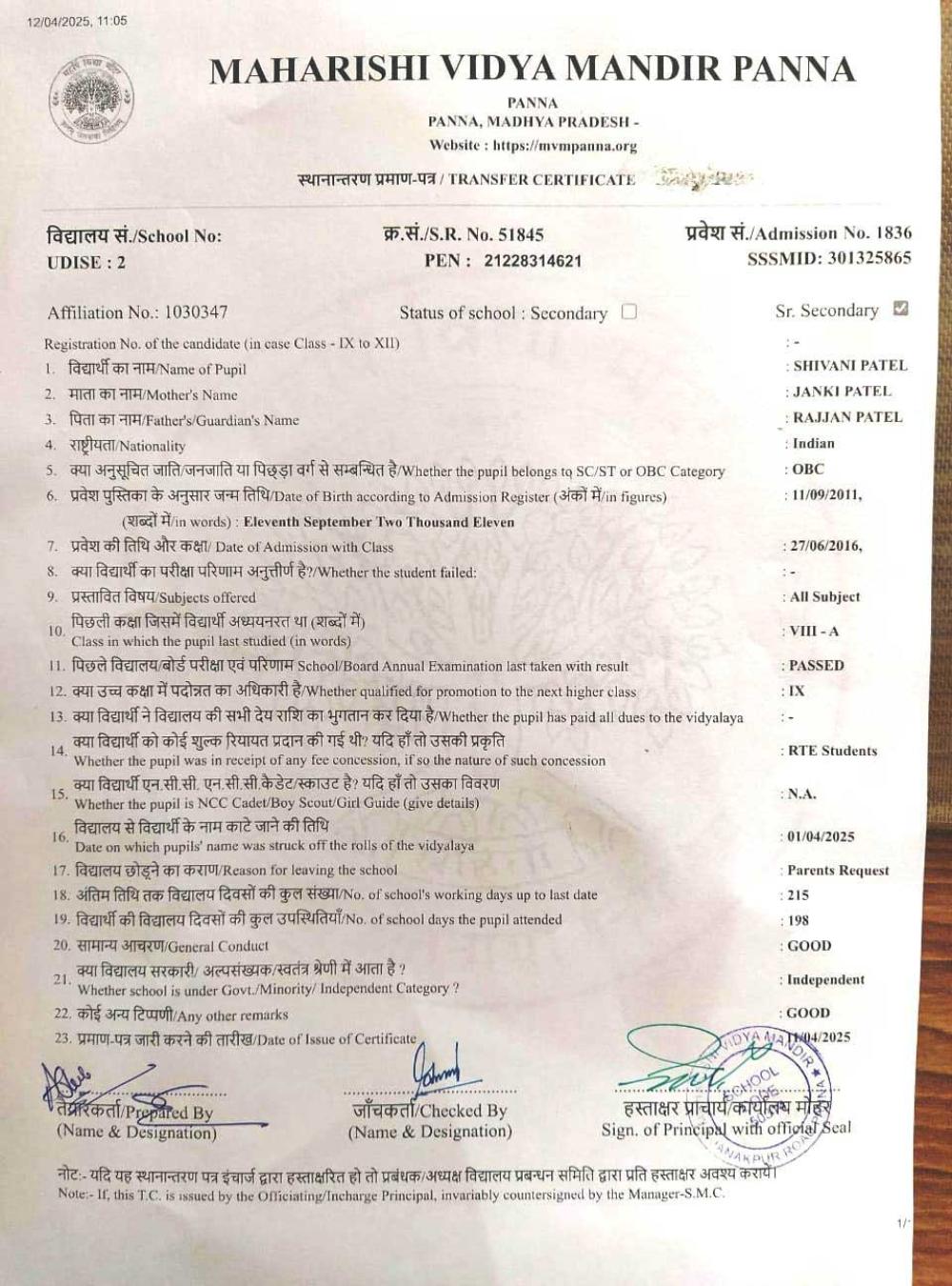| 12 | 1836 | SHIVANI PATEL | VIII | A | |