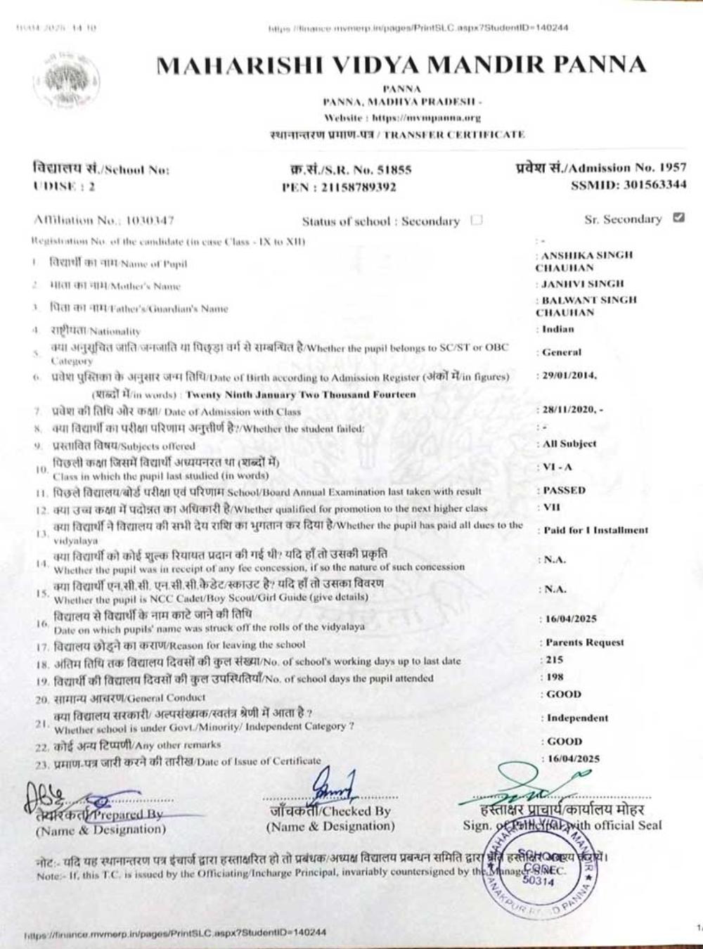 | 20 | 1957 | ANSHIKA SINGH CHAUHAN | VI | A | |