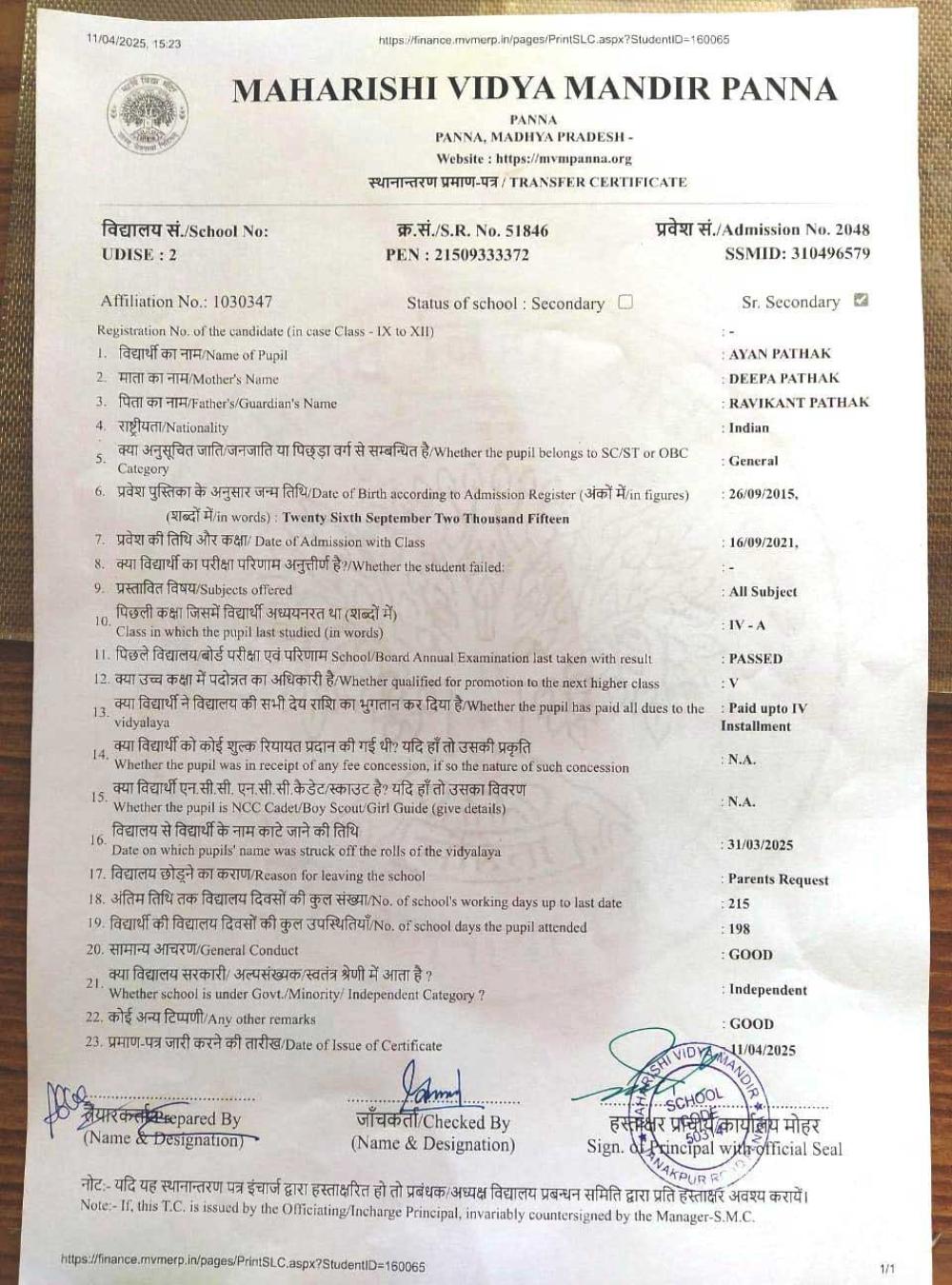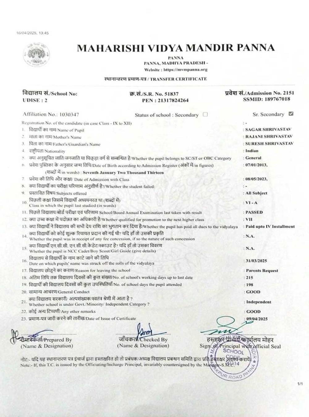 | 13 | 2151 | SAGAR SHRIVASTAV | VI | A | |