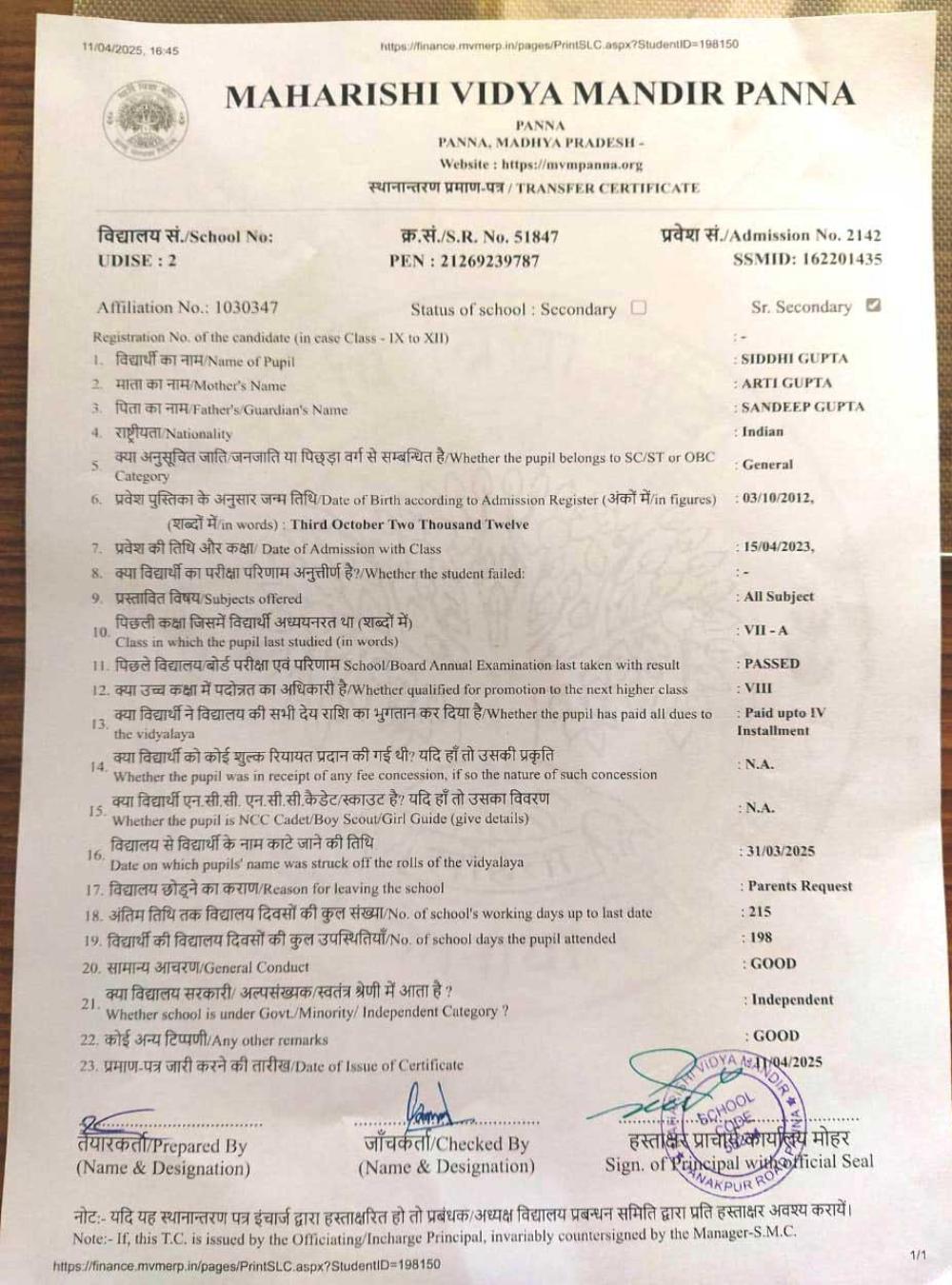 | 10 | 2142 | SIDDHI GUPTA | VII | A | |
