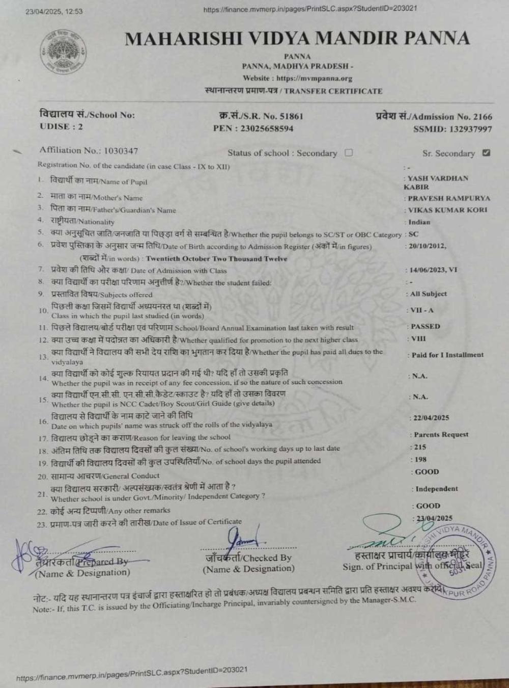 | 4 | 2166 | YASH VARDHAN KABIR | VII | A | |