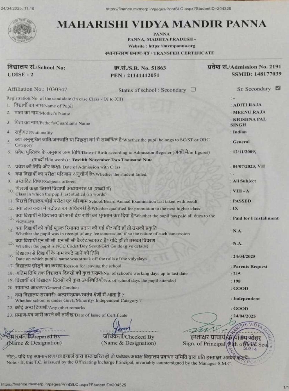| 7 | 2191 | ADITI RAJA | VIII | A | |