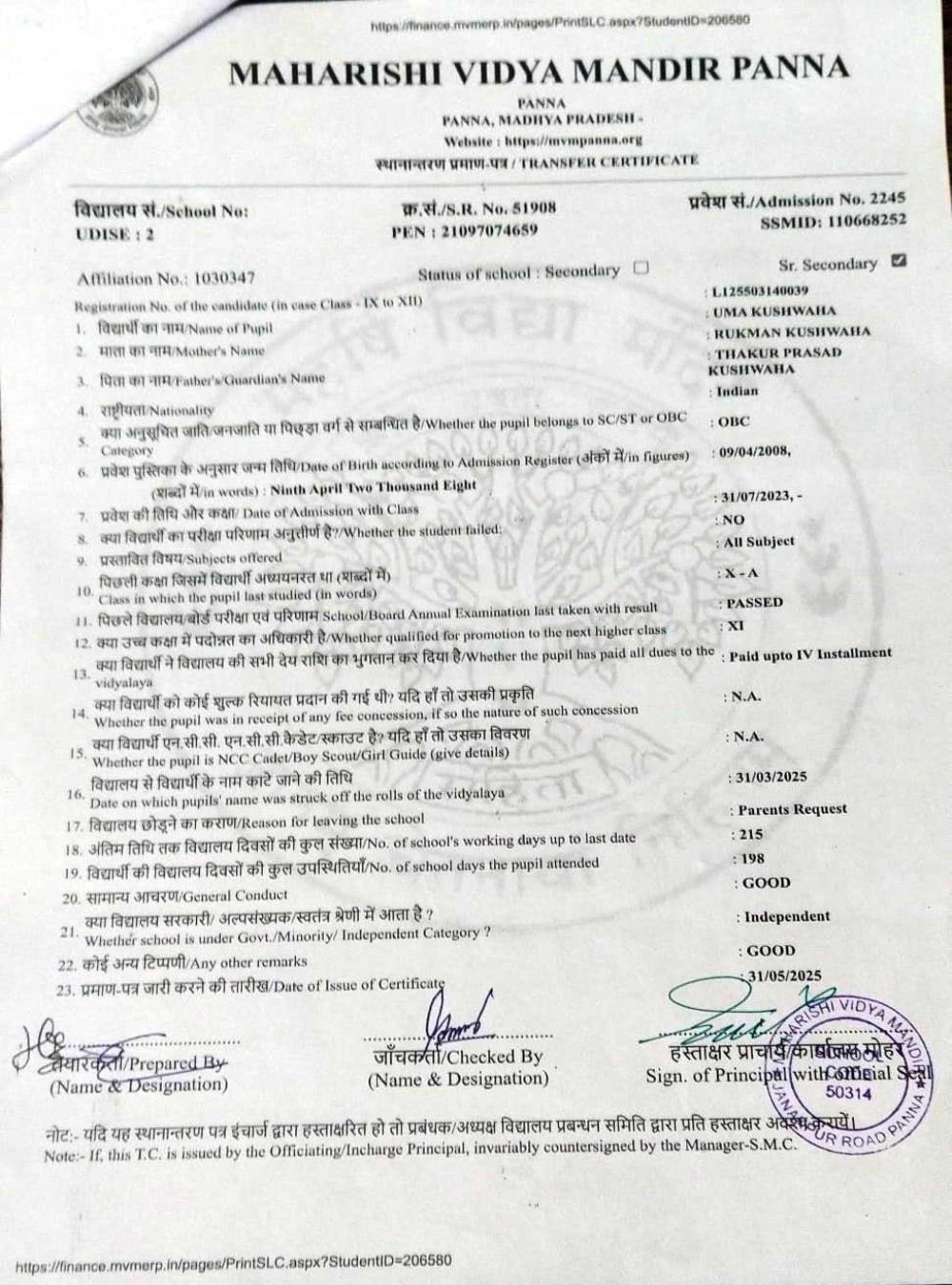 | 3 | 2245 | UMA KUSHWAHA | X | A | |