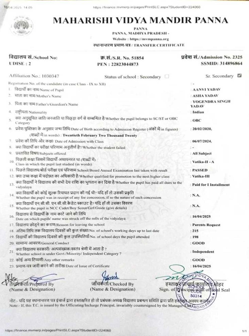 | 22 | 2325 | AANVI YADAV | II | A | |