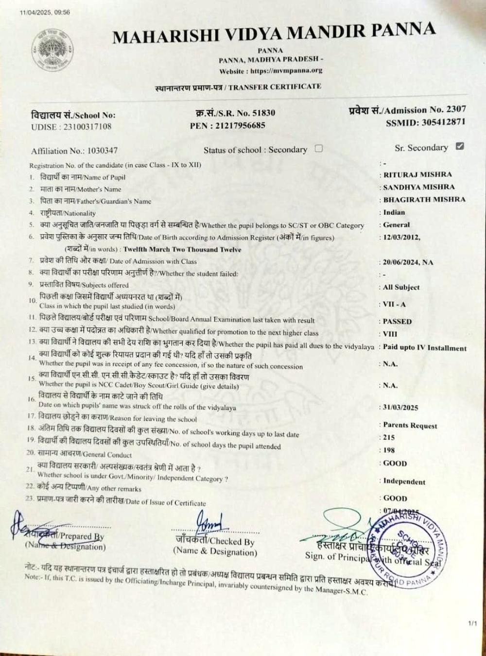 | 26 | 2307 | RITURAJ MISHRA | VIII | ||
