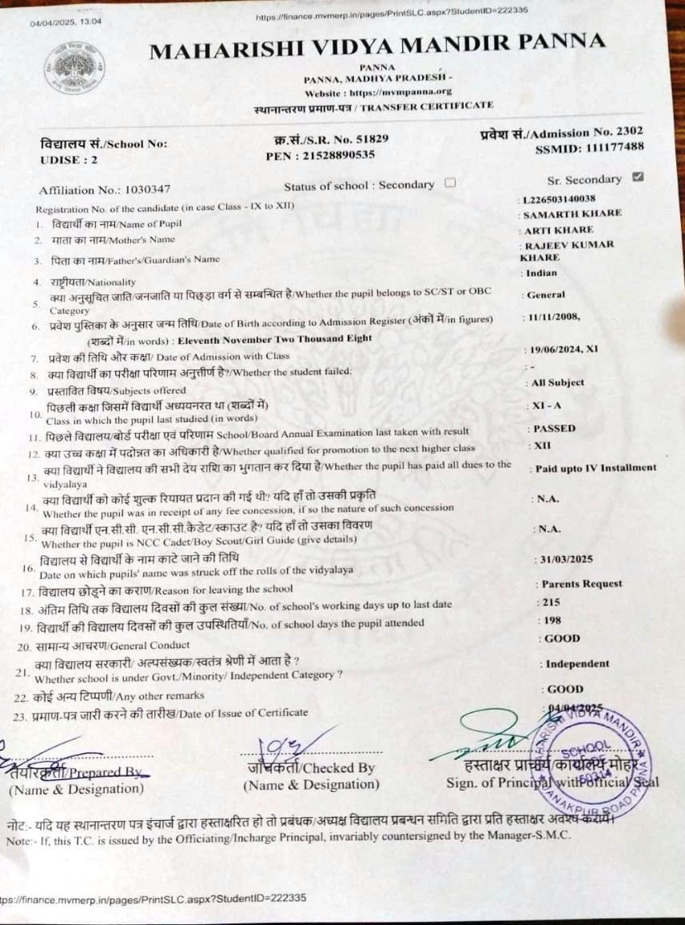 | 25 | 2302 | SAMARTH KHARE | XII | ||