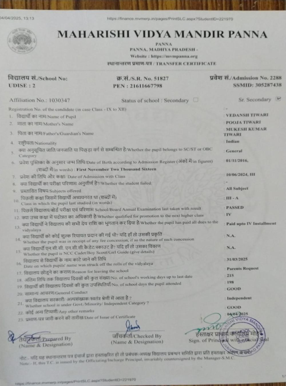 | 23 | 2288 | VEDANSH TIWARI | IV | ||