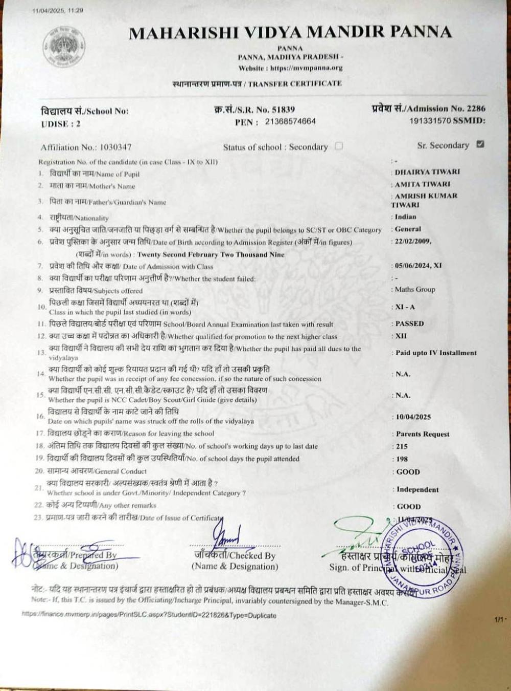 | 29 | 2286 | DHAIRYA TIWARI | XII | ||